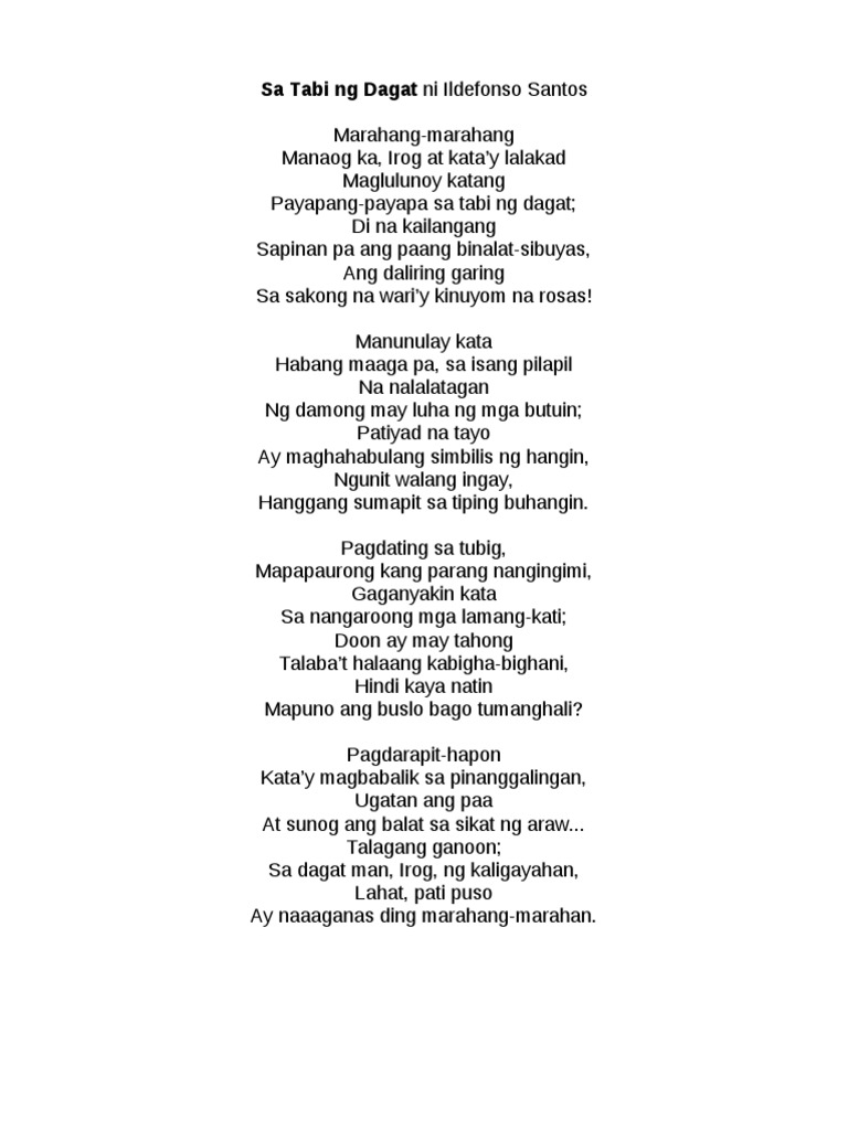 At ang unahan ng daong ay napabunggo at tumigil na hindi. This preview shows page 128 - 131 out of 197 pages. Tula at Talata para sa mga Nag iisa.