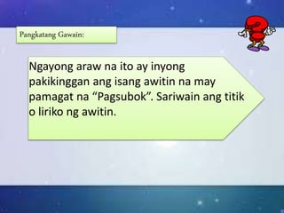 Ang pagkakaroon ng matatag na kalooban ay mahalaga sa isang batang katulad mo. Balikan Suriin ang sumusunod na mga sitwasyon. Lagyan ng tsek kung ito ay ginagawa mo at ekis X kung hindiIsulat sa papel.